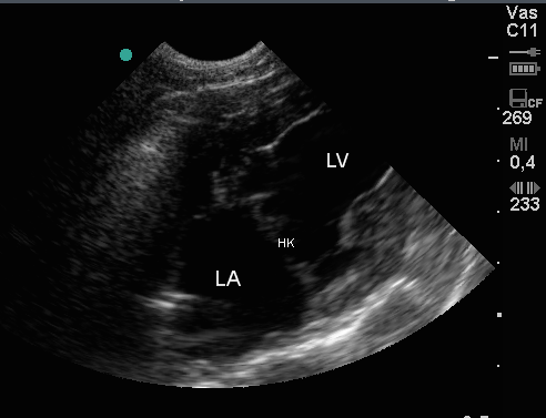 Das unterste Bild zeigt die geschlossene Herzklappe (HK)zwischen der linken Vorkammer (LA) und Kammer (LV).